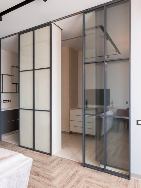Как правило, перегородки делают высотой от пола до потолка. Раздвижные двери устанавливают на специальные роликовые механизмы, чтобы они бесшумно скользили из стороны в сторону при открытии. Количество и размер секций в перегородке зависят от размеров проёма, а также от толщины стеклянных элементов, так как она влияет на общий вес конструкции и, соответственно, учитывается при расчете всех параметров цельного изделия.